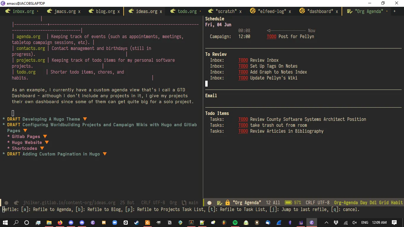 As an example, I currently have a custom agenda view that I call a dashboard - although I don’t include any projects in it, I give my projects their own dashboard since some of them can get quite big for a solo project. Excuse the windows laptop, my Linux machine is currently being repaired.